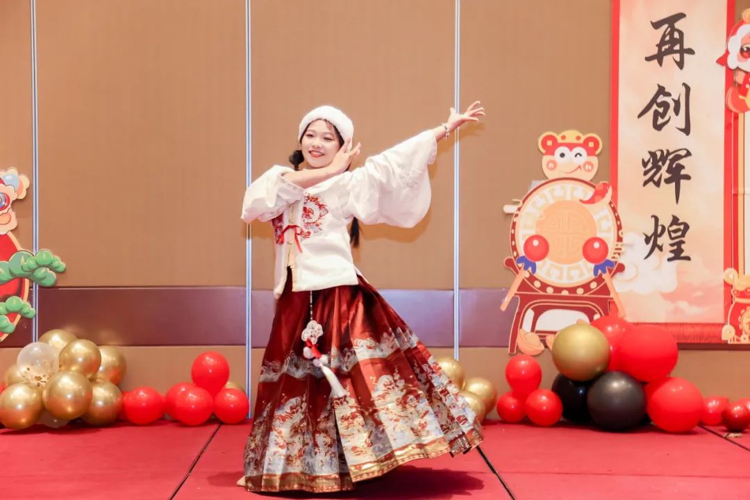 胡老师身着精美的马面裙,在桃花朵朵开的伴奏下翩翩起舞。她的舞姿轻盈,笑容洋溢,充满活力的演出预示着新春的生机与希望。